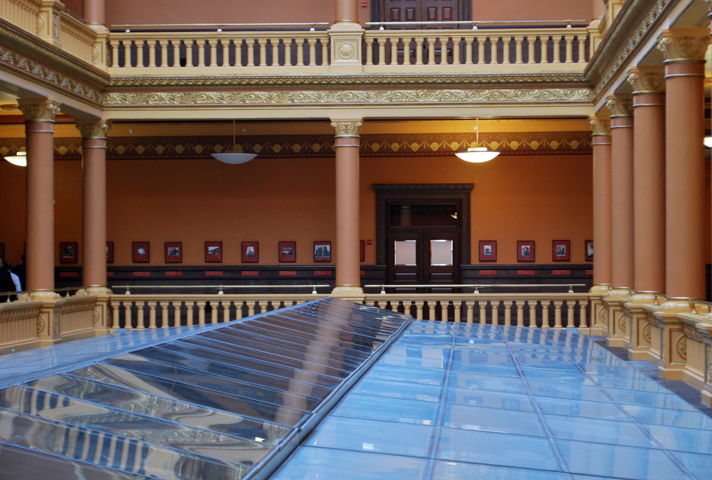 The exhibit is located in the building’s three-story atrium. The Duberstein courthouse, built in 1892, is itself designated a New York City Landmark.